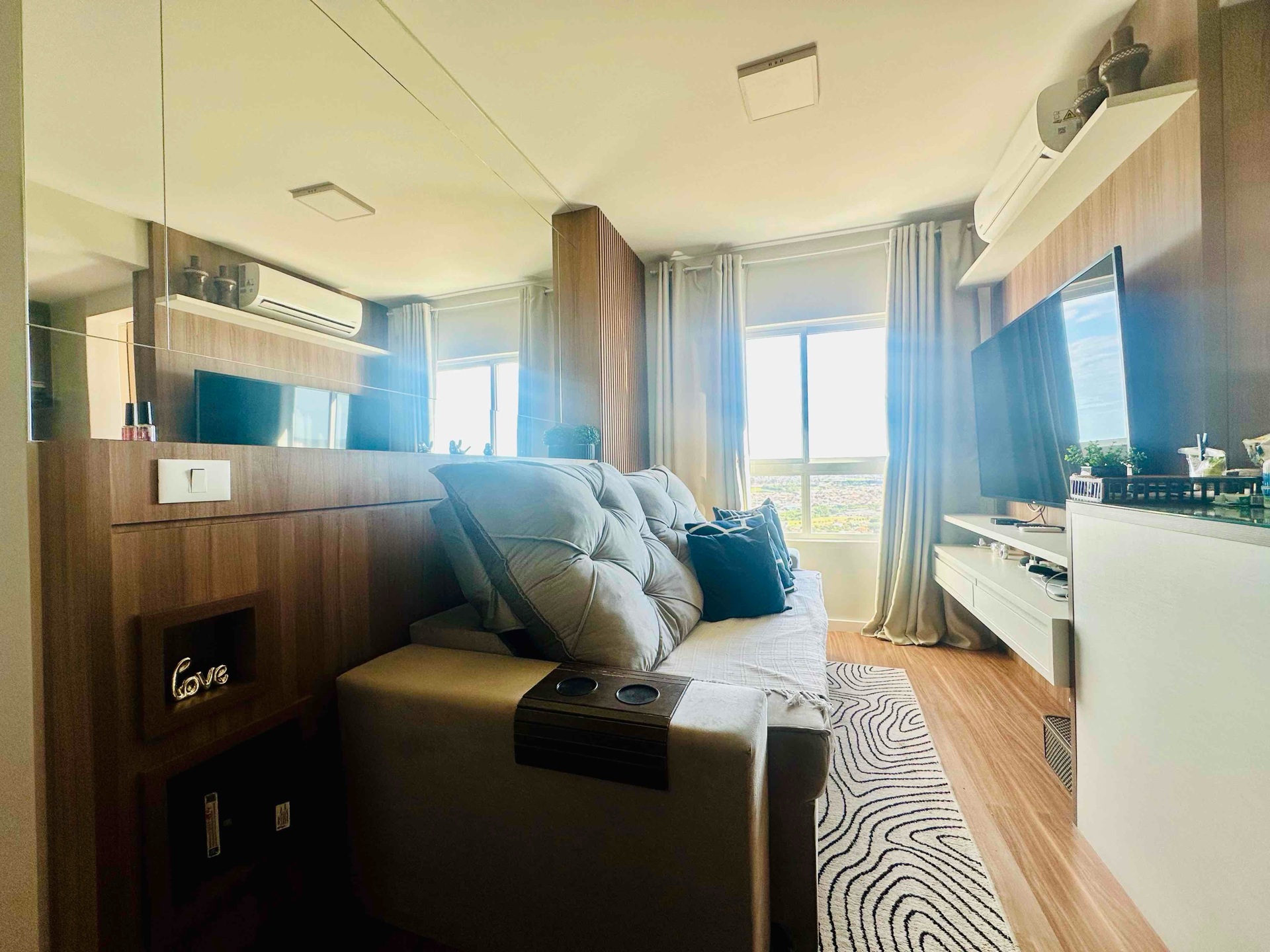 Ar condicionado na sala, que tambem conta com decoração em espelhos e ripado.