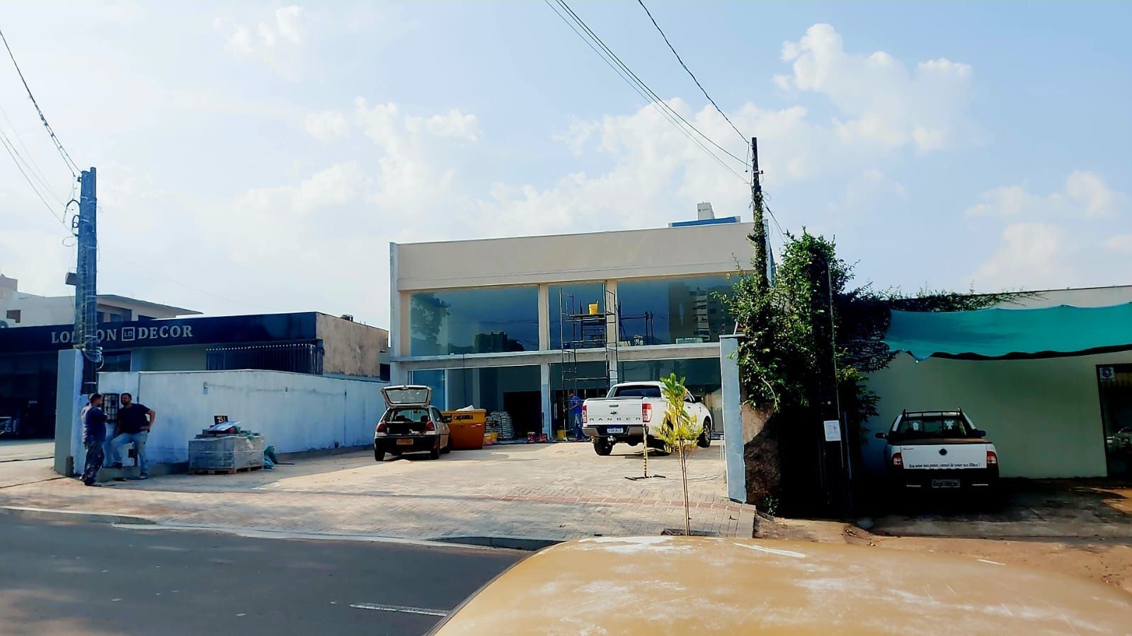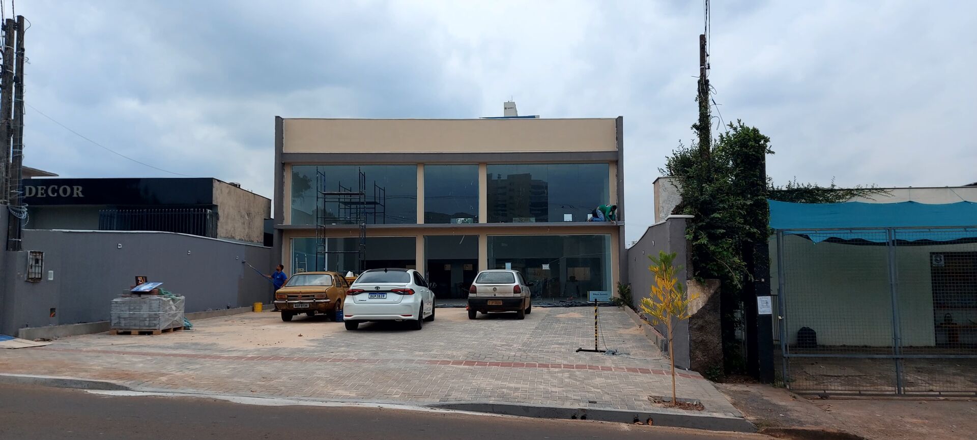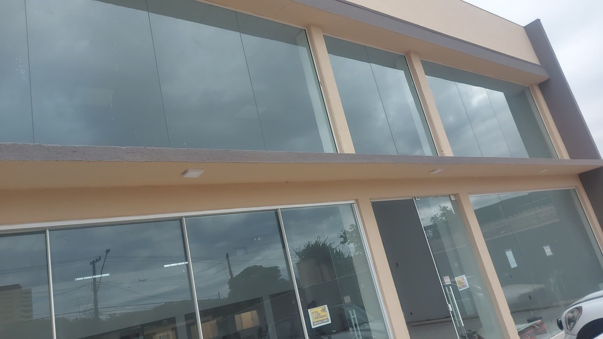 Fachada total em vidros, Piso em porcelanato, Possibilidade de entrada de veículos no interior do salão. Com porta de serviço deslizante de 4m2 de largura, Entrada Social com duas portas de giro, pátio frontal, calçada em paver, muros laterais com iluminação em Led.
